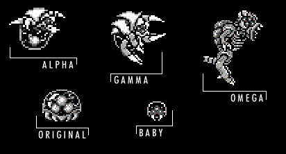 The second game in the Metroid series, this Gameboy game takes place on the planet SR388. This time, the Metroids populated the planet all by themselves and are run by the Queen Metroid. This time, the metroids start out as normal, oval shaped metroids and then transform to other shapes over the course of the game (see right).